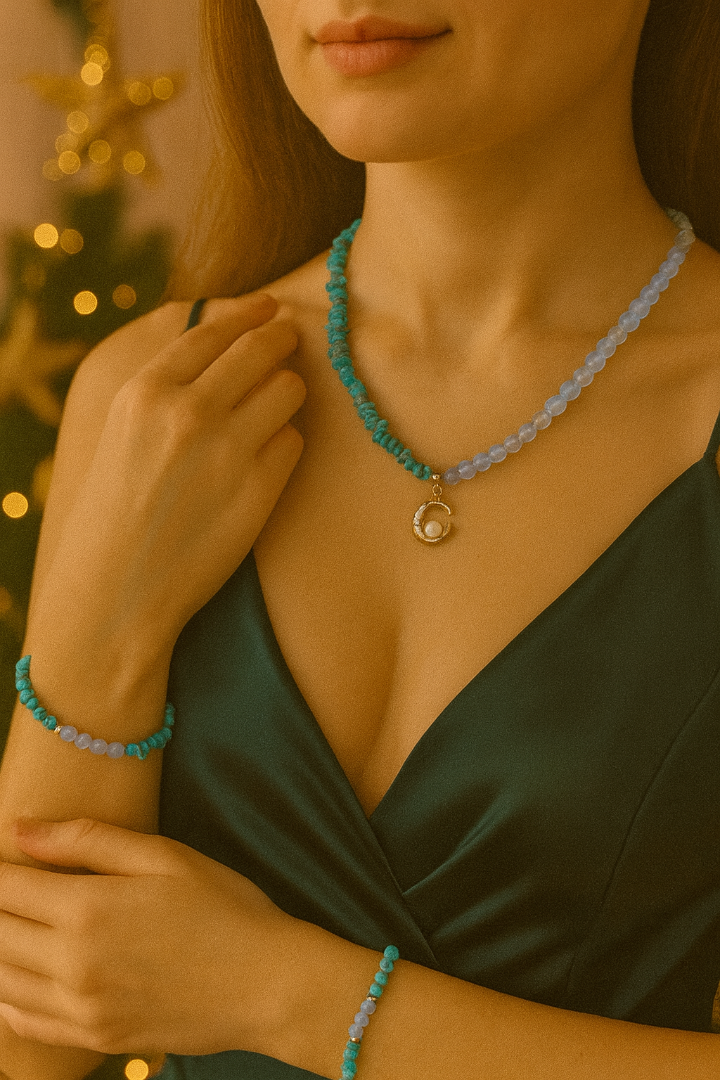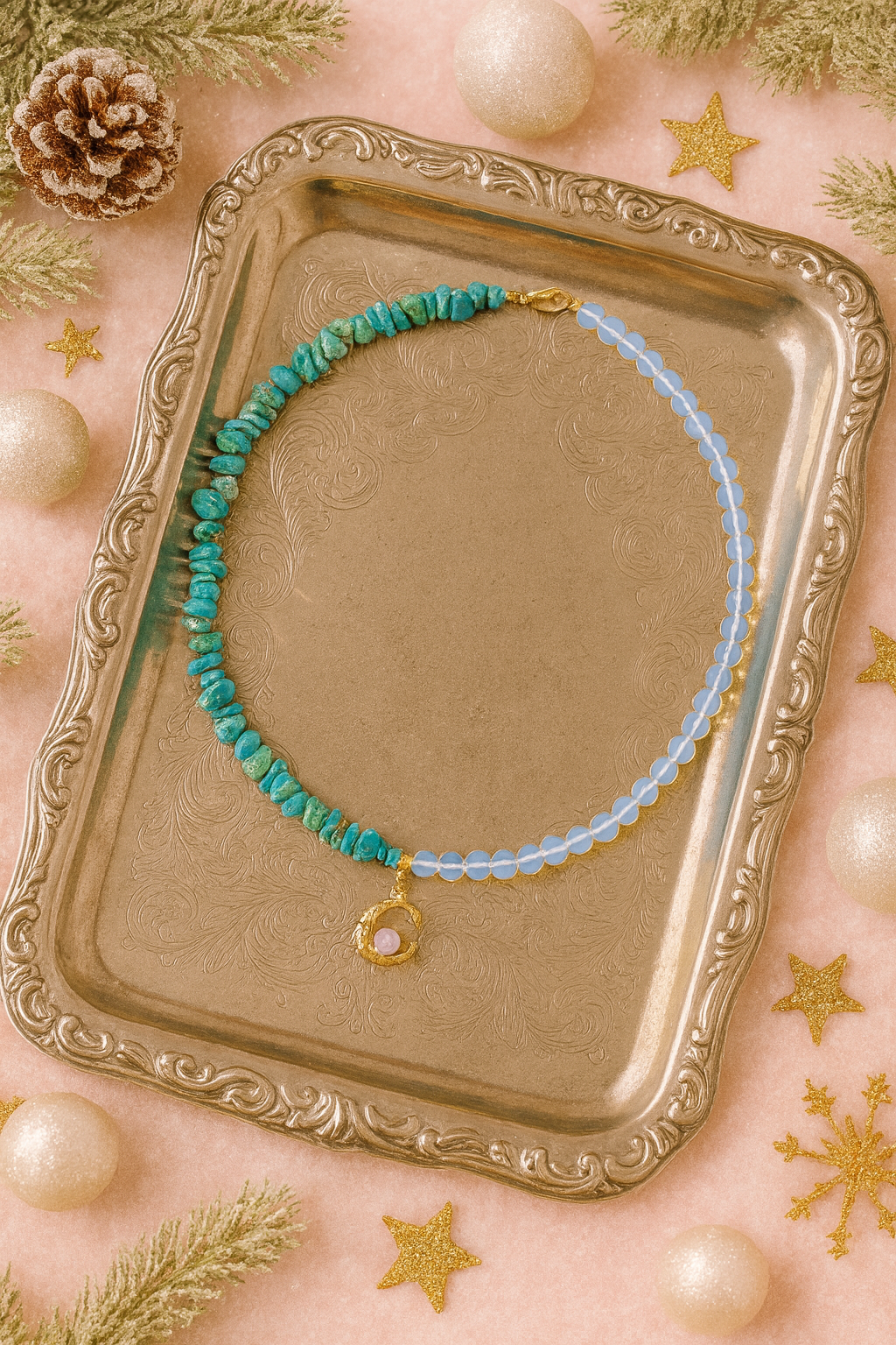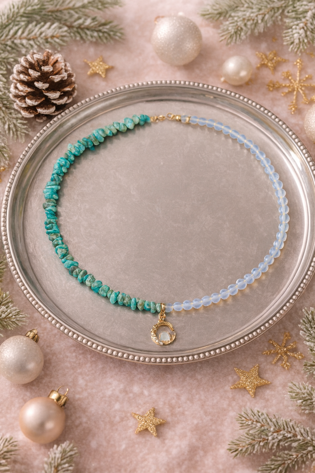 A turquoise and opal necklace — a vibrant yet delicate blend of natural colors. Turquoise brings a fresh, eye-catching tone with a summery feel, while opal adds a soft, iridescent shimmer that catches the light beautifully. A statement piece without being loud — perfect for vacations, summer outfits, and adding a bright accent to everyday basics. Looks especially stunning with white, beige, denim, light blue, and pastel shades.