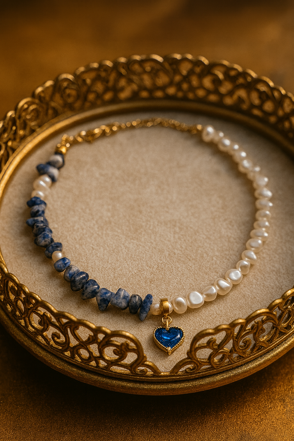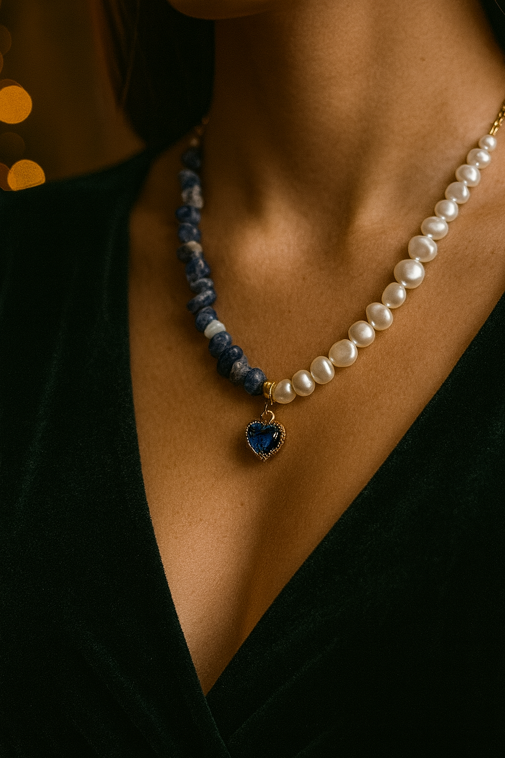 A necklace made with natural sodalite and freshwater pearls — a refined mix of deep blue gemstone tones and a soft pearly glow. Sodalite brings an elegant midnight-blue color with natural veining, while genuine freshwater pearls soften the look and add timeless sophistication. Calm, classy, and premium-looking — perfect for office outfits, everyday wear, and evening looks. Pairs beautifully with white, black, grey, beige, and navy.