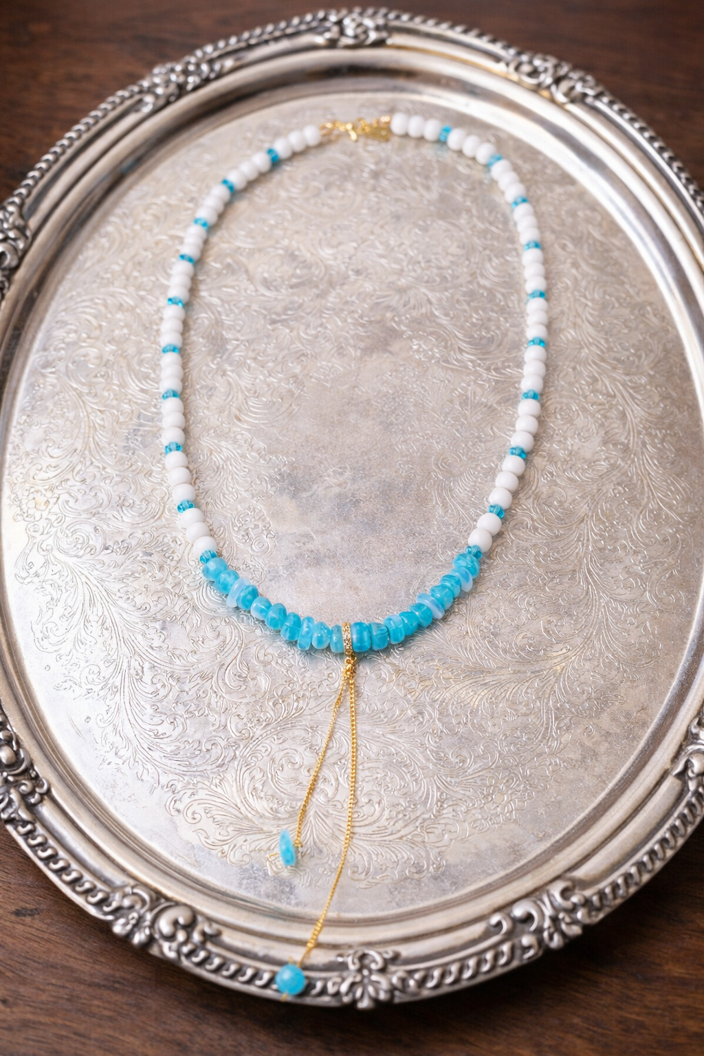 The centerpiece is an 18K gold-plated pendant, adding a warm contrast and a touch of elegant luxury.