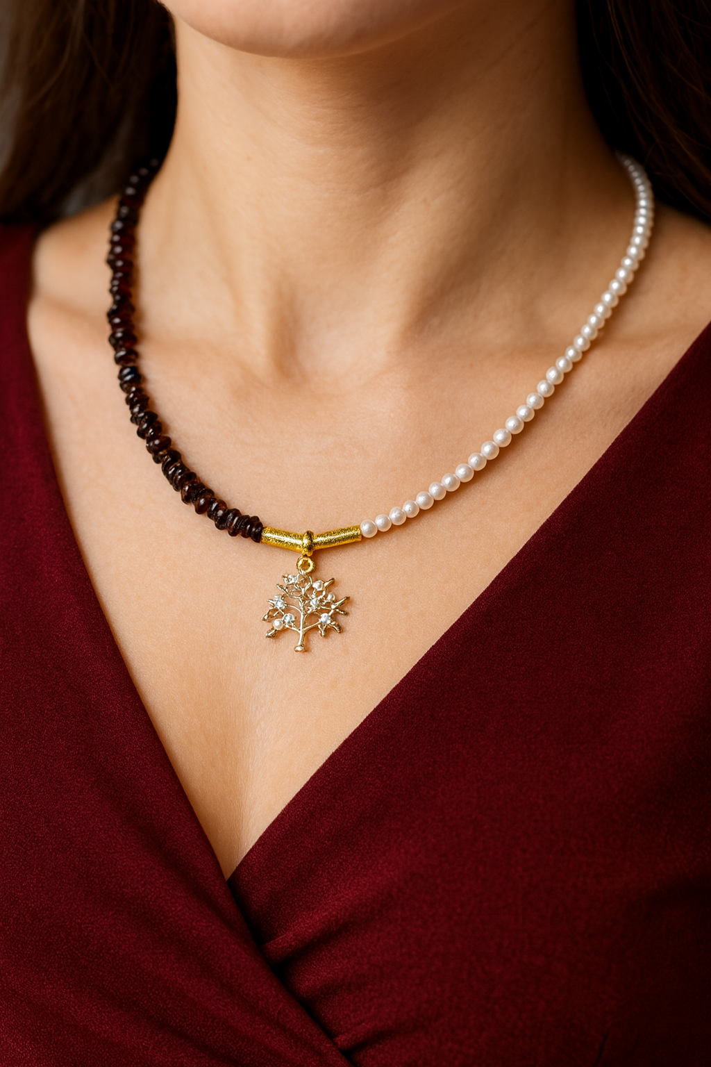 An elegant necklace made with natural garnet and freshwater pearls — a blend of deep wine-red intensity and soft pearly glow.