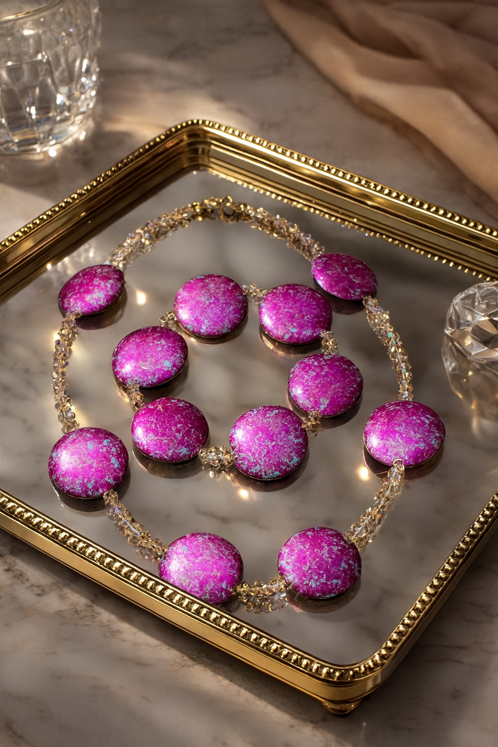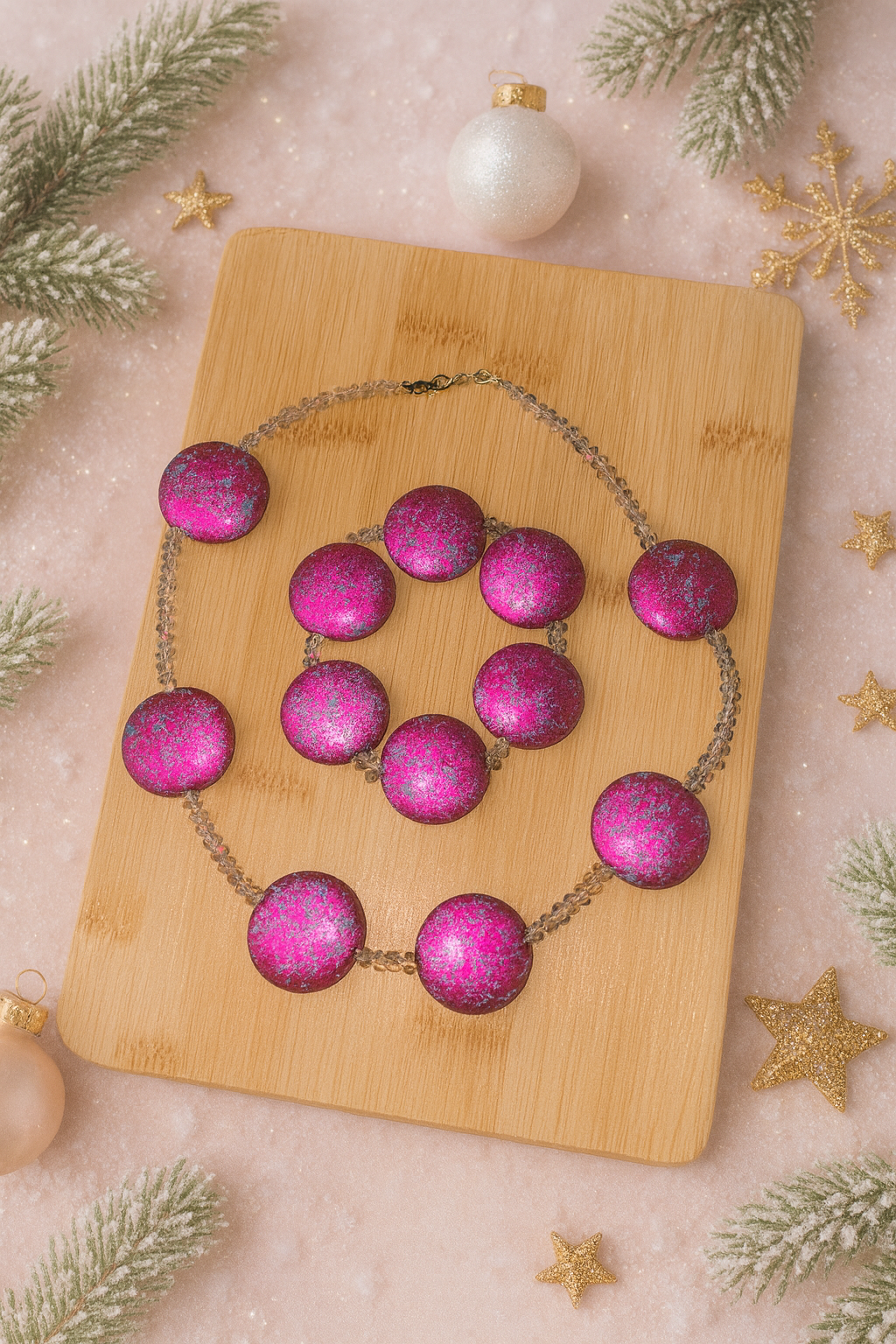 Set: a necklace and bracelet made with pink round decorative beads and crystals — a delicate, sparkling combination that adds softness and a refined shine to any look. The round beads create a clean, polished style, while the crystals catch the light beautifully, making the set elegant but not too bold. Perfect for romantic outfits, celebrations, and everyday wear — especially lovely with white, pastels, beige, and black.