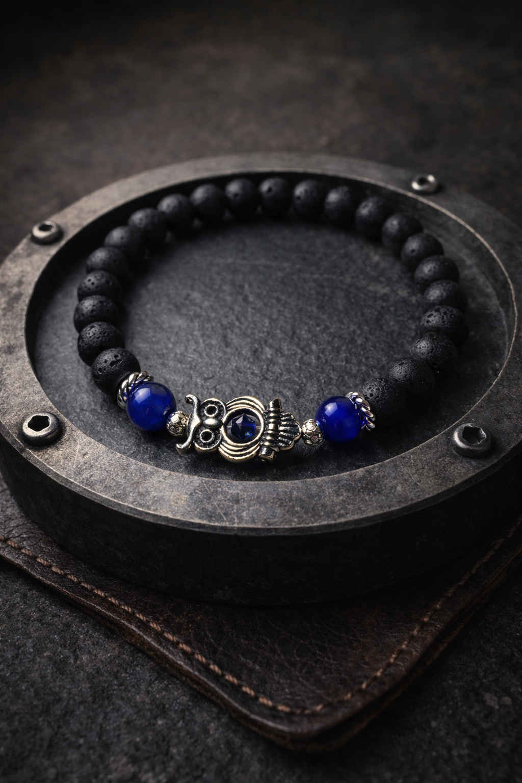 Men’s bracelet made of natural lava stone with a “Owl” charm. The matte, textured lava beads create a strong, rugged look, while the owl symbolizes wisdom, intuition, and protection. Deep blue accent beads add a bold contrast, making the bracelet eye-catching yet masculine — perfect for casual, street style, or smart-casual outfits.