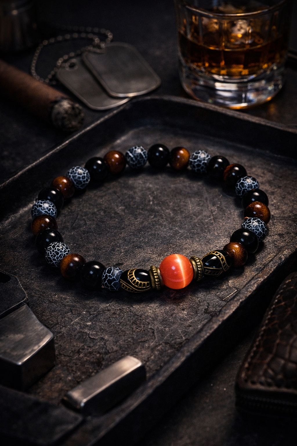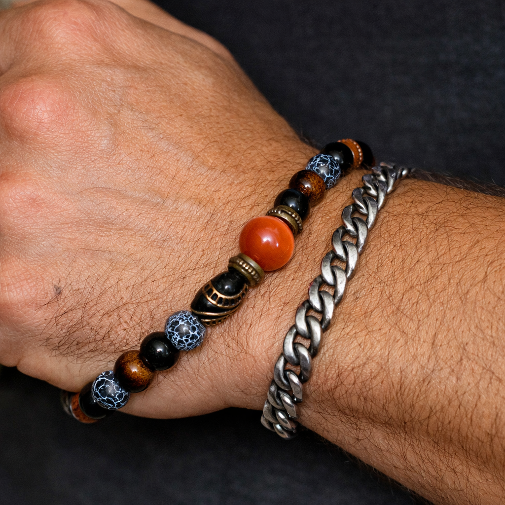 A bold, masculine bracelet with a strong central accent. The mix of warm brown and deep black beads gives a confident, powerful look — often chosen as a “money” talisman for luck in business and steady income.