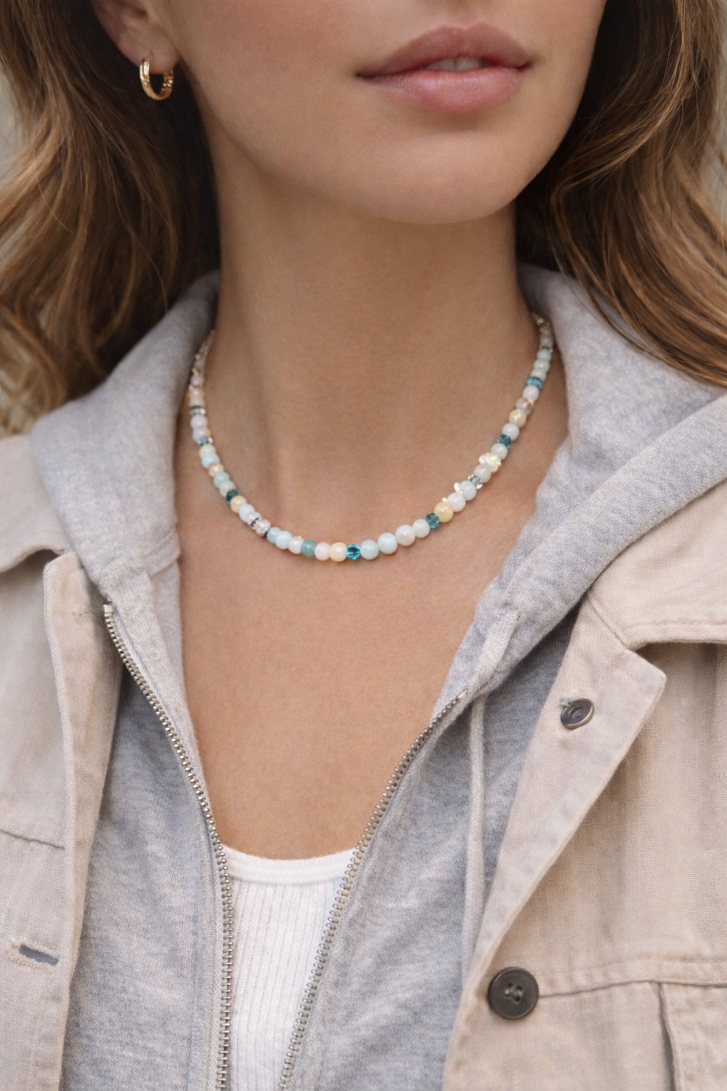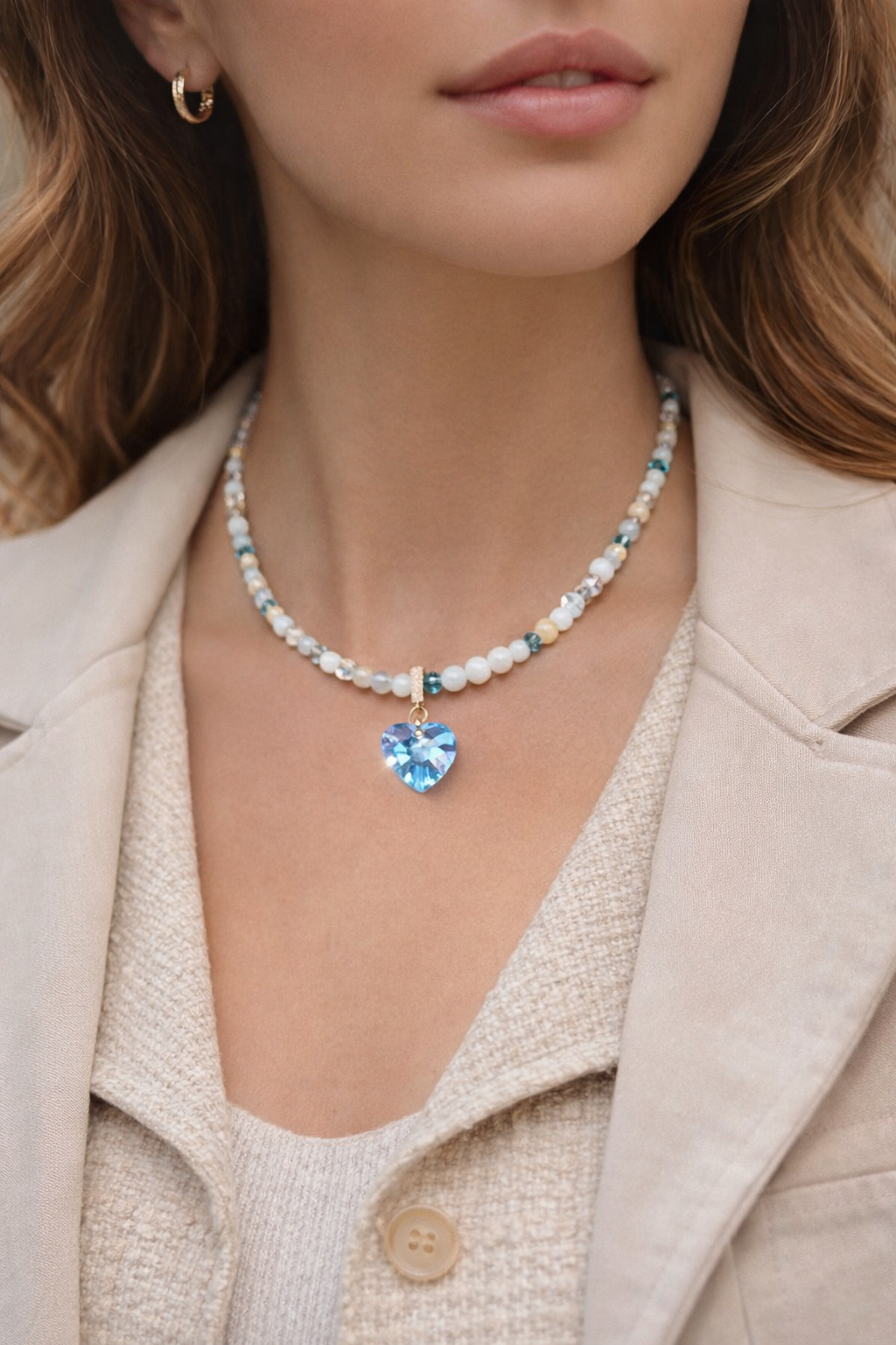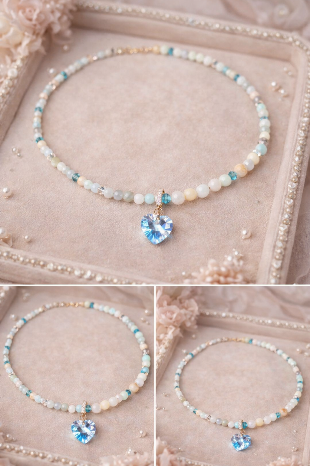 - A delicate necklace made of natural amazonite in a soft “sea-glass” palette — perfect for romantic outfits and everyday wear. The focal point is a detachable Swarovski heart crystal pendant: wear it with the charm for sparkle, or remove it for a cleaner minimalist look.