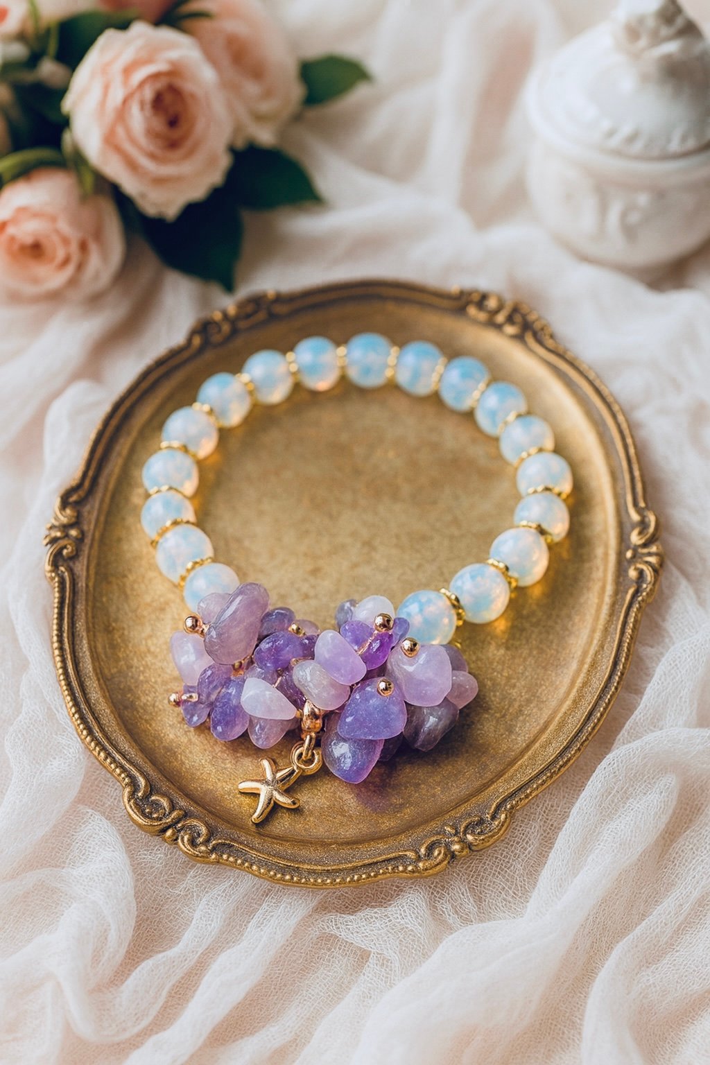 Изящный браслет из опалита и аметиста, излучающий спокойное, нежное сияние. Полупрозрачный опалит красиво отражает свет, а аметист добавляет более глубокий оттенок и ощущение гармонии. Легко сочетается как с повседневными, так и с более нарядными образами — идеальный вариант для продуманного подарка или повседневного украшения.